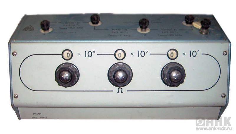 Прибор Р4001 предназначен для работы в качестве меры элекрического сопротивления класса точности 0,1 в цепях постоянного и переменного тока. Основные технические характеристики прибора Р4001:   Число декад: 3. Номинальные сопротивления ступеней: 104, 105, 106 Ом. Номинальная мощность на одну ступень: 0,05 Вт. Номинальное напряжение на магазине при включении одной ступени старшей декады: 300 В. Наработка на отказ: 5000 ч. Рекомендуемая замена: Р40101 .