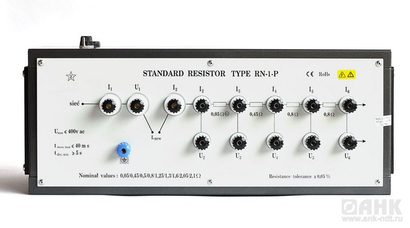 Мера сопротивлений RN-1-P обеспечивает задание активного сопротивления из ряда: 0,05 Ом; 0,45 Ом; 0,5 Ом; 0,8 Ом; 1,25 Ом; 1,3 Ом; 1,6 Ом; 2,05 Ом; 2,1 Ом. Предел допускаемой основной погрешности - ± 0,05% (± 0,1%).