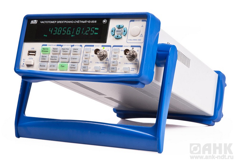 • 3 канала. Диапазон частот: 1 и 2 канал: 1 мГц … 200 МГц; 3 канал (опция): 3 ГГц, 6,5 ГГц, 12,4 ГГц, 16 ГГц. Измерения: отношение частот, период, временной интервал, фазовый сдвиг, время нарастания/ спада, длительность/ скважность импульса и количество импульсов (счетчик); погрешность ОГ 2*10-7/год (опционально: 5*10-8/год и 5*10-10/год);