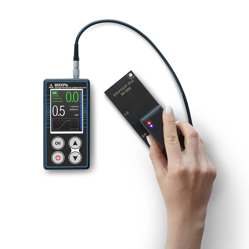 При сканировании материала дефектоскоп ВИХРЬ совмещает два метода: магнитный и вихретоковый. Благодаря этому можно контролировать конструкции с грубой и загрязненной поверхностью, а также вести измерения сквозь изолирующее покрытие или слой коррозии. Для исследования материалов с покрытием, имеющим переменную толщину, не требуется внесение дополнительных настроек.